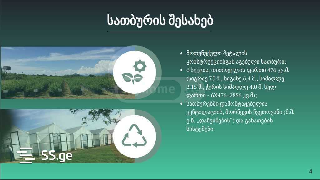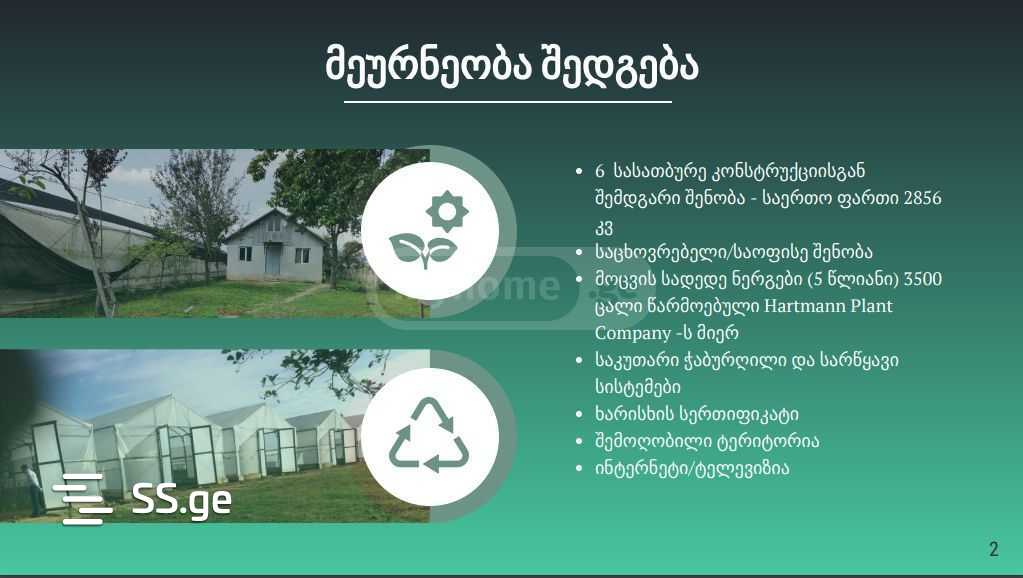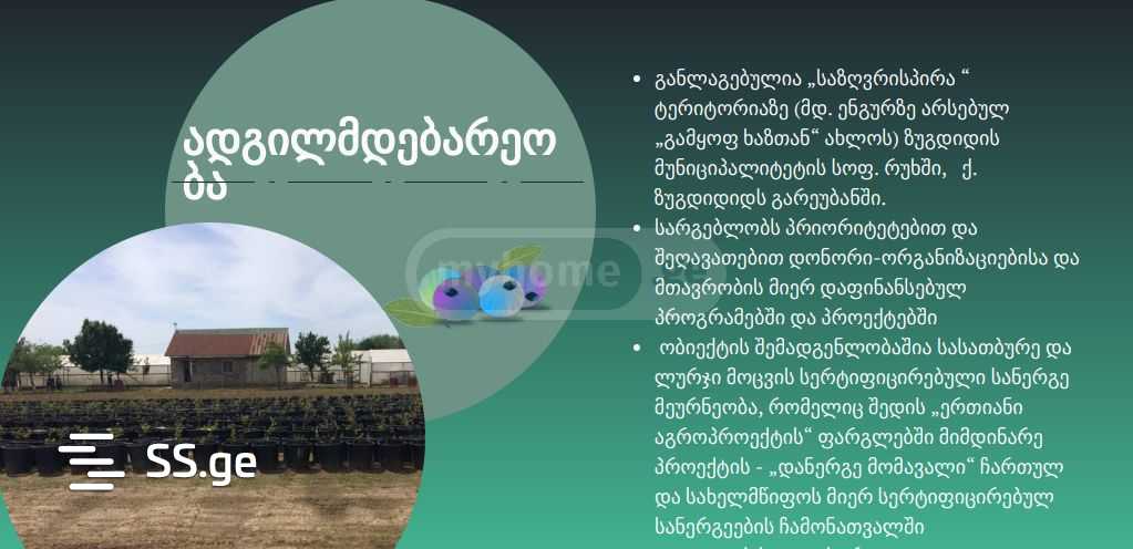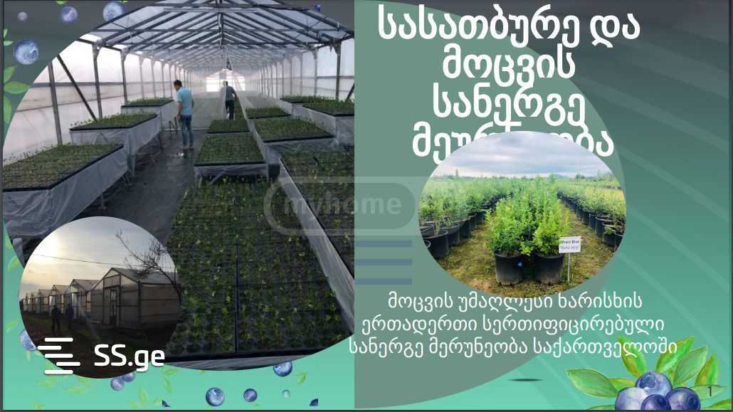 Продается единственный сертифицированный питомник черники в Грузии. Здание, состоящее из 6 тепличных конструкций. Общая площадь 2856 кв.м. Жилое/офисное здание. Саженцы голубики (5 лет) 3500 производства Hartmann Plant Company Собственный колодец и оросительная система Сертификат качества Огороженная территория Интернет/ТВ. Он расположен в «приграничной» зоне (недалеко от «линии раздела» на реке Ингури) села Зугдидского муниципалитета. в Рухе, ул. в пригороде Зугдидиди. Имеет приоритеты и преимущества в программах и проектах, финансируемых донорскими организациями и правительством.