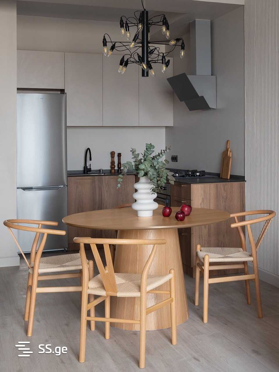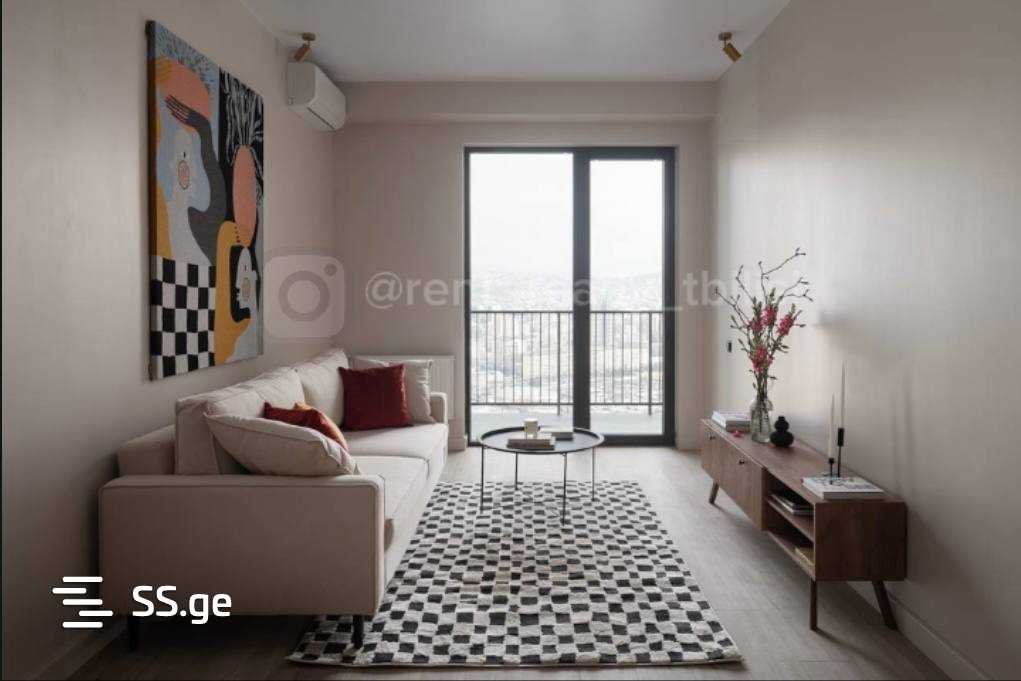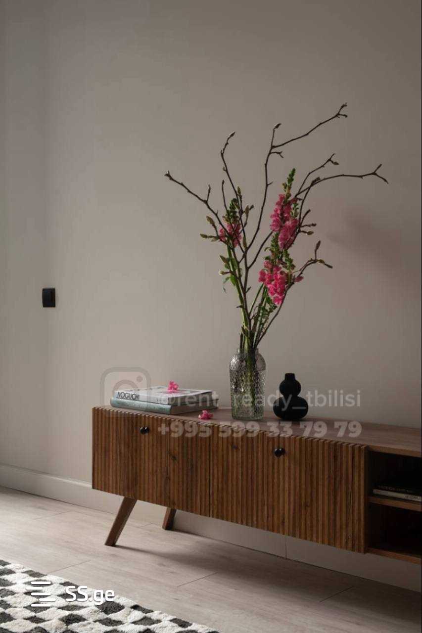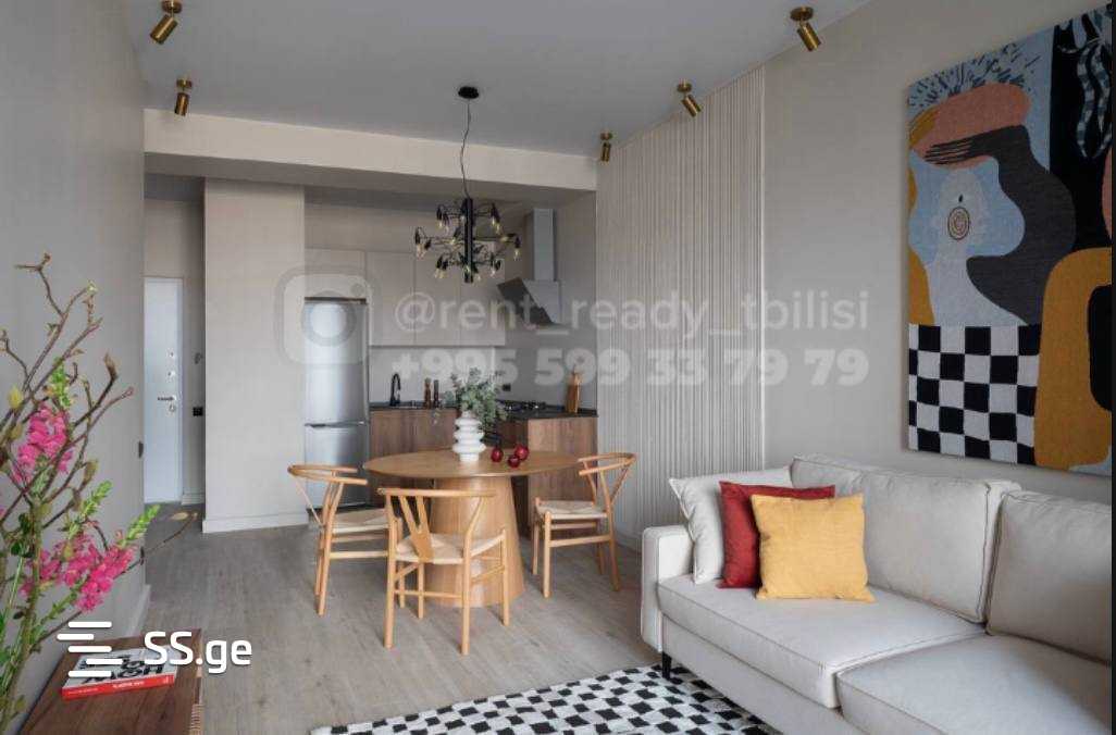 Площадь включает просторную комнату, которая объединяет гостиную и кухню, а также отдельную спальню с гардеробом и ванной.