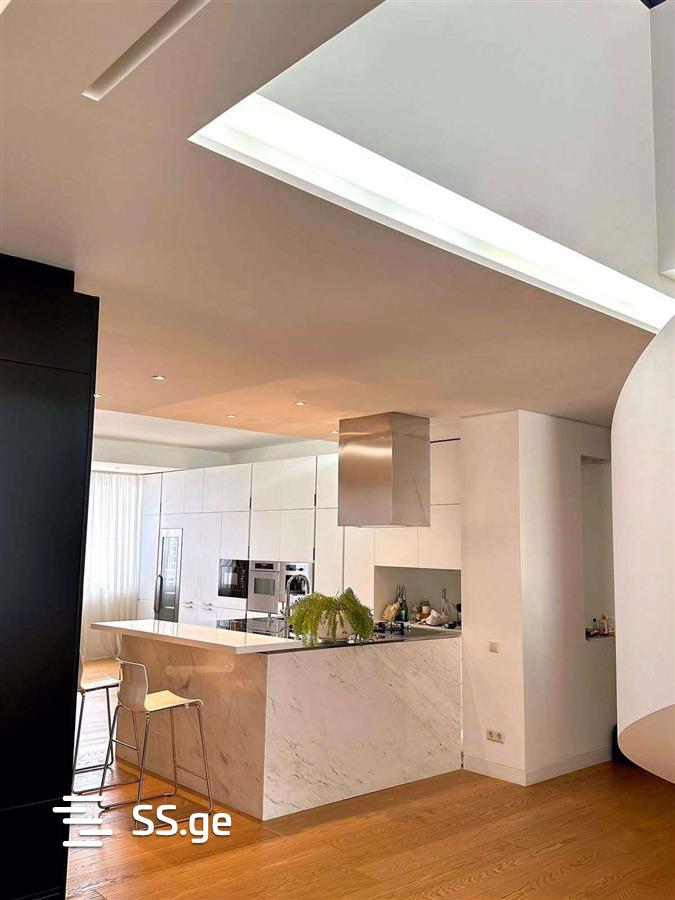 Общая площадь 350 кв м, жилая 280 кв м, 2 террасы 55 кв м, 4 балкона. Три главные спальни с ванными комнатами. Туалет для гостей. Кабинет, большая гостиная, кухня. Вторая небольшая рабочая кухня. 2 гаража.