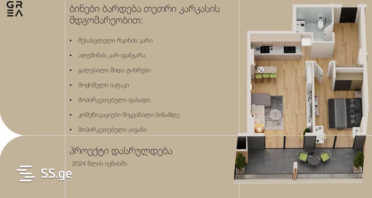 იყიდება ბინები საცხოვრებელი კორპუსი მდებარეობს ვაკეში, მრგვალ ბაღთან 500 მეტრში მშვიდ და გამწვანებულ გარემოში. 5 სართულიან კორპუსში დაგეგმილია 15 ბინა და 2დონიანი ავტოსადგომი. პროექტთან ახლოს მდებარეობს: სპორტულ გამაჯანსაღებელი ცენტრი ქსელური მარკეტები კვების ობიექტები საბავშვო ბაღი აფთიაქები სასწავლო ცენტიბინები ბარდება თეთრი კარკასის მდგომარეობით:• შესასვლელი რკინის კარი• ალუმინის კარფანჯარა• გალესილი შიდა ტიხრები• მოჭიმული იატაკი• მოპირკეთებული ფასადი• კომუნიკაციები მიყვანილი ბინამდე• მოპირკეთებული აივანიპროექტი დასრულდება2024 წლის ივნისშიპარტნიორი ბანკი ლიბერთი
