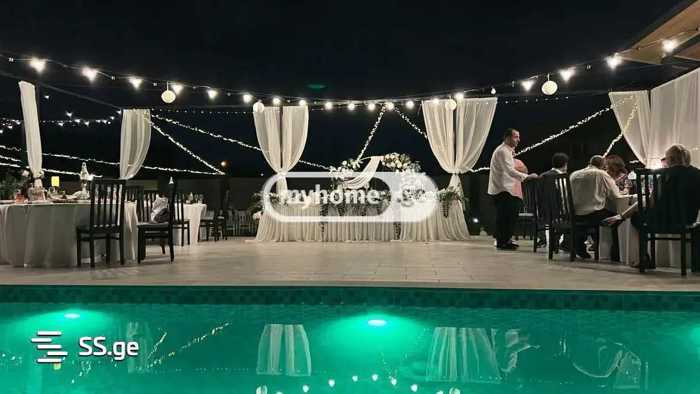 Акция в этом месяце!! Сдается дом для праздников. В пространстве вас ждут: 2 кондиционированных зала (подземный зал с динамиками, лазерами и диско-шаром) с инвентарем. Столы, стулья, посуда. Полностью оборудованная кухня, во дворе мангал, 2 санузла, 1 спальня и 2 комнаты отдыха, также на 3 этаже есть еще 2 спальни и 1 санузел (не включены в начальную стоимость) дом полностью укомплектован всем необходимым инвентарем 1200 кв. м двор с открытым бассейном и джакузи, цена зависит от количества гостей, у нас есть как фуршет, так и обслуживание традиционного грузинского стола, а также дизайн (для дня рождения, свадьбы и других мероприятий).