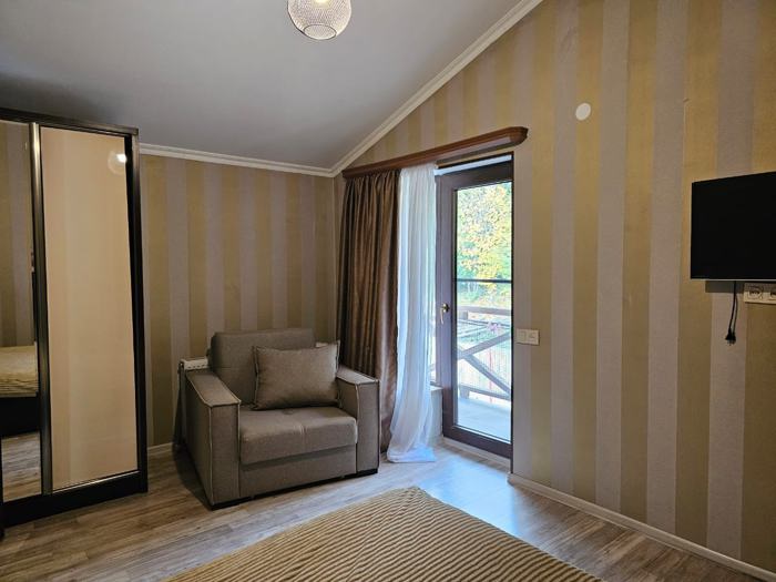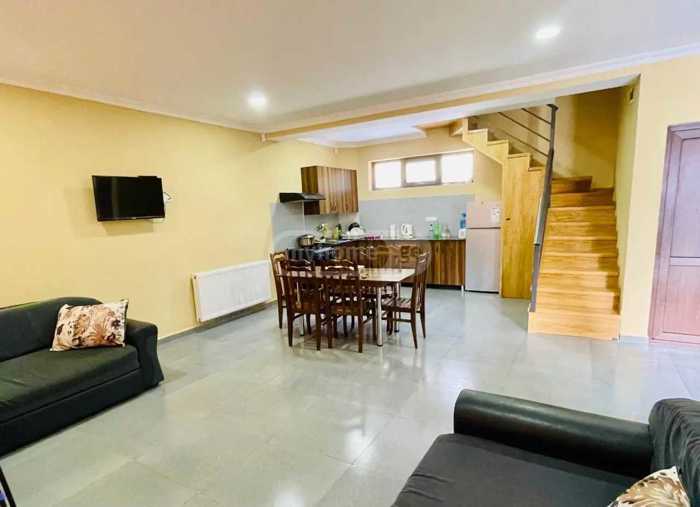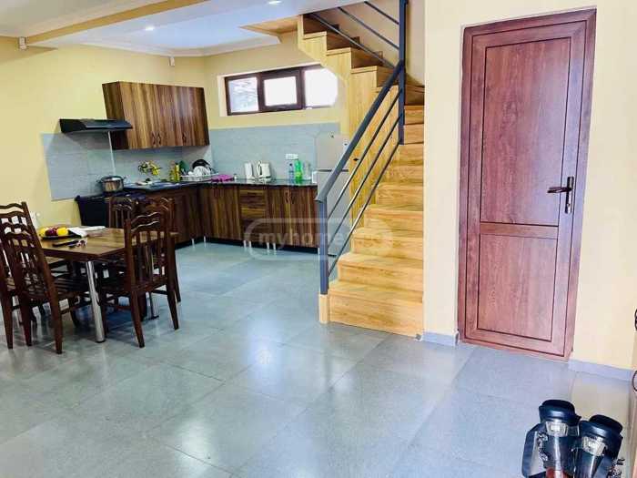 Сдается загородный дом в Бакуриани.На улице Коба Цакадзе, за комплексом Вилла Монте, на опушке леса, в уютном и тихом месте сдается чистый коттедж, оборудованный по новым современным стандартам. Дом рассчитан на 7+2 человек, на первом этаже большая гостиная студийного типа с кухней-камином, так же на первом этаже санузел, на втором этаже две спальни с необходимым постельным бельем. и полотенца, санузлы индивидуальные. На кухне большое количество посуды, в том числе гриль, электрическая духовка, электрочайник, тостер и все необходимые атрибуты для кухни. В коттедже также есть музыкальный центр. У коттеджа благоустроенный двор, во дворе есть качели и садовая мебель.