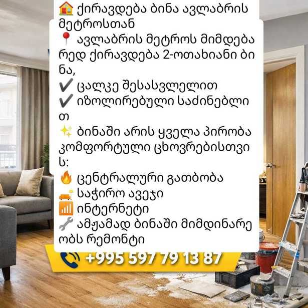 Сдается частная квартира площадью 60 кв.м, рядом с метро Авлабари. Квартира состоит из 2 комнат, с изолированной спальней, удобной и комфортной планировкой. 🏠 В квартире есть все необходимые условия: ✔ центральное отопление ✔ стиральная машина ✔ холодильник ✔ необходимая мебель ✔ телевидение ✔ интернет 🔧 В настоящее время идет ремонт, квартира будет сданы в чистом и аккуратном состоянии. 📍 Идеальное месторасположение - рядом с метро Авлабари, удобный транспорт и развита инфраструктура.