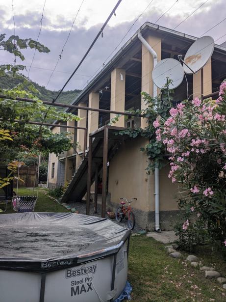 Продается дом в Мцхета на улице Героев. Дом 300 квадратных метров. Три этажа по сто метров каждый. Один из них - полуподвальный. Также есть большой чердак, который можно оборудовать под проживание. 4 спальни, очень большой зал, большая терраса с красивым видом. Виден монастырь Джвари. Высокие потолки. Два парковочных места на территории дома, бассейн. Также на территории два хозблока. Подъехать к дому можно с двух улиц. Двор 600 квадратных метров. Свежий воздух, к дому проложен хороший асфальт.