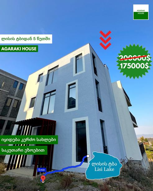 Ликвидационное предложение! Не пропустите ликвидационную скидку в 25 000 $ и купите 3-этажный частный дом с подвалом и собственным двором за 175 000 $ вместо 200 000 $, всего в 5 минутах от озера Лиси по цене квартиры. Коттедж - это место, где природа, спокойствие и город гармонично сосуществуют. Эффективное строительство и проект. 3 этажа + подвал - 350 м². Двор - 250 м². Черновая отделка - для ремонта, основное фасадное покрытие готово, крыша гидроизолирована, внутренние перегородки выполнены. Установлены высококачественные алюминиевые энергосберегающие окна. Подключены вода, природный газ и электричество. Панорамный вид на Тбилиси, Лиси и Кавказ. В данной местности обслуживается общественным транспортом. Скидка: 200 000 $ → 175 000 $. Оценка банка: 200 000 $ и более.