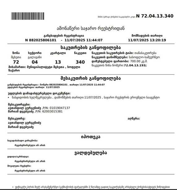 Продается лучшее место по лучшей цене, как для дачи, так и для проживания. На вершине Сагурамо (в Закарии) все коммуникации на месте... Вокруг началось строительство, лучшие виды... Очень хорошая цена, 1120м2 + 200м2 - на который у меня есть план. Короче говоря, хорошее место по хорошей цене.