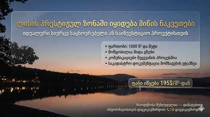 Продаются участки от 1000 м² (возможно изменение площади) 🏗 Планируется: • Асфальтированная дорога • Тротуары • Упорядоченная территория с единым проектом 🌿 Окружающая среда: • Тихая и экологически чистая • Красивые виды • Идеально для проживания или дачи ⚠️ Не заливается – безопасная зона 💼 Инвестиции: • Быстро развивающееся направление – Верхний Лиси • Высокий потенциал роста цен