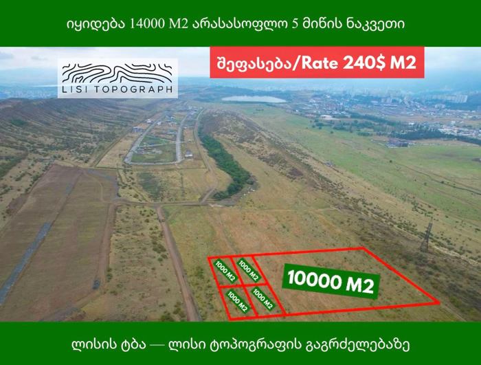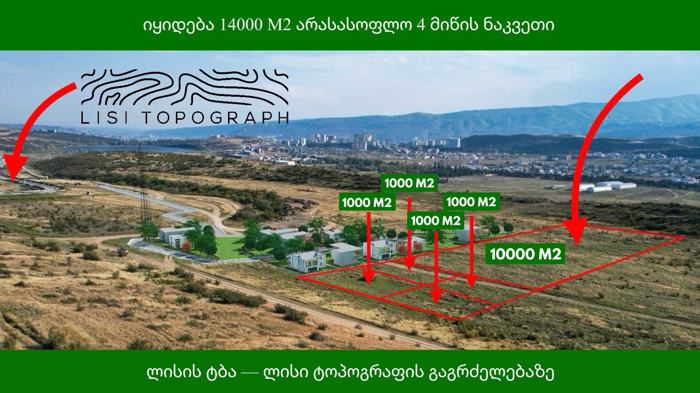 Лучшие земельные участки у озера Лиси, в 300 метрах Продаются 6 инвестиционных участков рядом с озером Лиси Площадь каждого участка: 1900 кв.м Цена за квадратный метр: 300$ Будут выполнены следующие работы: - Вода - Газ - Электричество - Дренаж - Уличное освещение - Канал для слабого тока - Дорога, тротуар - Канализация - Бетонный забор высотой до полуметра со стороны дороги (в соответствии с проектом на будущее) - Установка ворот и заборов со стороны дороги - Озеленение общих территорий Рядом находится грузино-британская школа, школа Залдостанишвили, главной офис ТБС (бизнес-центр), Лиси Топография. Лучшее инвестиционное предложение, панорамные виды на Тбилиси и востребованная локация.