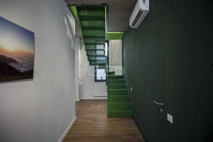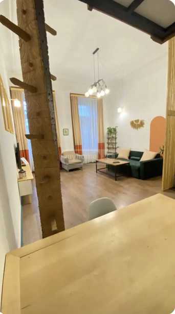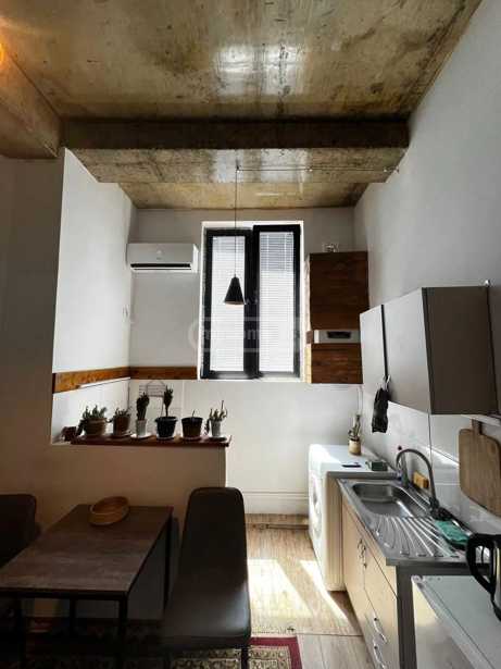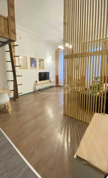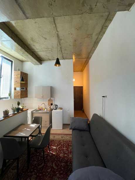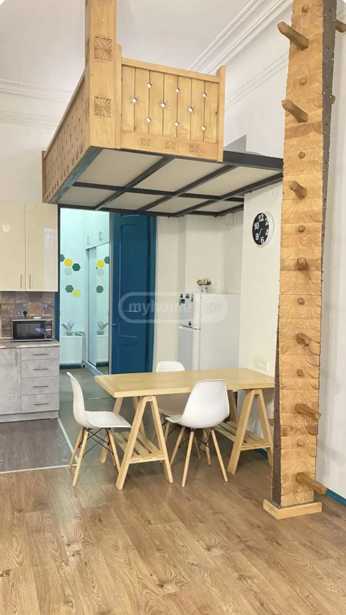 Квартира имеет студийный тип. Комната #1 - 35 кв. м Комната разделена на кухню и гостиную, в том же пространстве расположена антресоль. Из этой комнаты вы выходите в коридор, где стоит большой шкаф и стиральная машина. Отдельно выделена ванная комната, также вторая небольшая спальня с двухъярусной кроватью и рабочим столом. Небольшая спальня без окна. Несмотря на расположение квартиры в центральном районе, улица тихая.