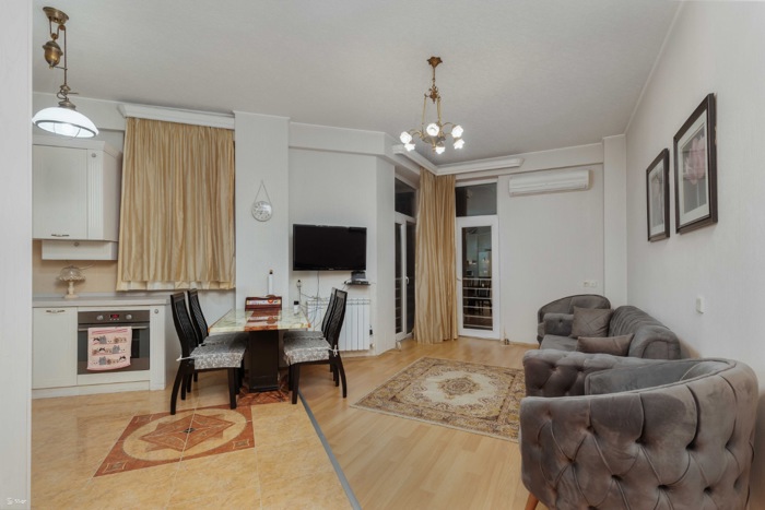 Сдается новая, нестандартного проекта квартира площадью 60 кв. м, расположенная на 8 этаже 9-этажного здания. В квартире имеется одна спальня и одна комната, а также один балкон, который создает дополнительный комфорт. Квартира отличается современным дизайном и новым ремонтом. В интерьере используется деревянный пол, что придает теплоту и уют жилью. В квартире оборудована столовая и отдельная прачечная, что делает повседневную жизнь еще более удобной. Эта квартира идеально подходит для тех, кто ценит спокойствие и современную обстановку. 2 месяца предоплаты