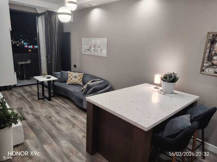 Сдается в центральной части Дигоми, перед гражданским судом, в новом корпусе. Две очень светлые спальни, два балкона, один из которых закрытый, а другой открытый. У закрытого балкона есть большой встроенный шкаф. Вид с балкона гостиной и кухни выходит на Мцхету. У здания есть охраняемый вход и два лифта. Рядом находятся популярные продуктовые сети и автобусная остановка. Есть возможность аренды с парковкой. Также идеально подходит для студентов, так как обе спальни оборудованы учебными столами.