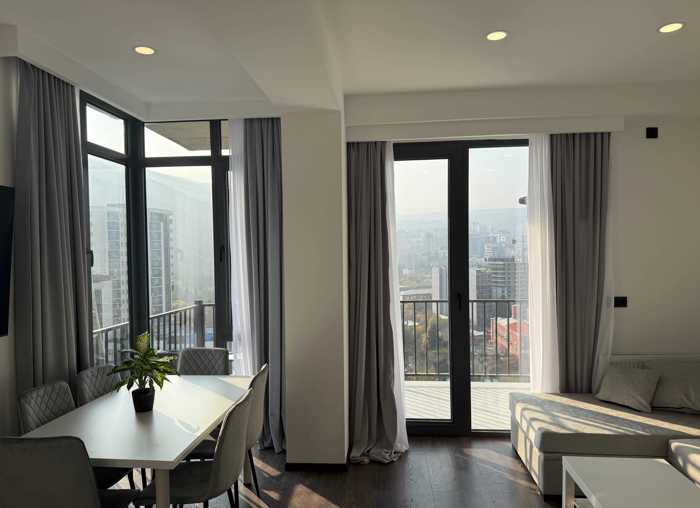Сдается в Ортачала (рядом с Министерством внутренних дел) Площадь 87 кв.м Большая кухня-студия с 2 спальнями В каждой комнате есть выход на балкон, откуда открывается вид на Тбилиси Центр. Отопление+ Печь+ Со всеми удобствами Этаж 12/13 Цена 650$
