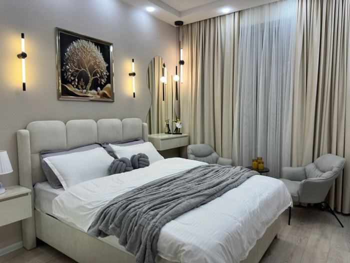 Сдается 2-комнатная отремонтированная квартира на улице Мебрдзолта в новостройке с новой мебелью и новой техникой (холодильник, стиральная машина, телевизор, Wi-Fi) и всем необходимым инвентарем. Цена: 450 долларов США.