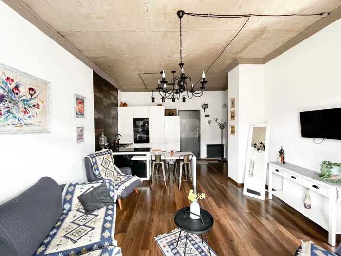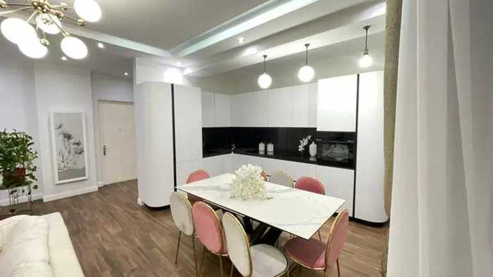 Сдается новая квартира нестандартного проекта площадью 56 кв.м, расположенная на пятом этаже 16-этажного здания. В квартире есть одна спальня и две комнаты, а также один балкон. В интерьере представлены уютная гостиная и столовая с большими окнами и стеклянной дверью, что обеспечивает естественное освещение. Кухня и столовая полностью оборудованы. Квартира выделяется современным дизайном и яркой атмосферой, создавая приятную и теплую обстановку. Защищенное и оборудованное камерами подъезд.