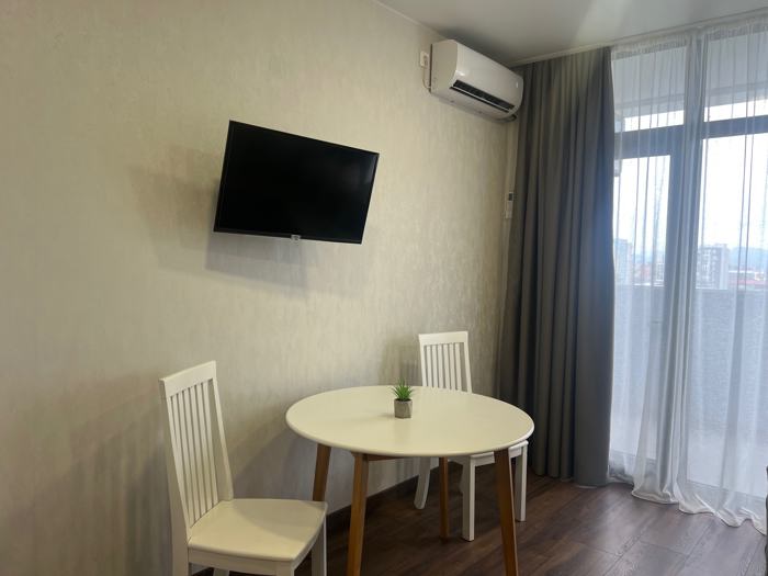 Сдается в аренду в Батуми на улице Юрия Шартавы, 33 кв.м. в новом здании на 9-м этаже, двухкомнатная с одной спальней, с ремонтом, мебелью, техникой, отопление электрическое. Цена 300 долларов