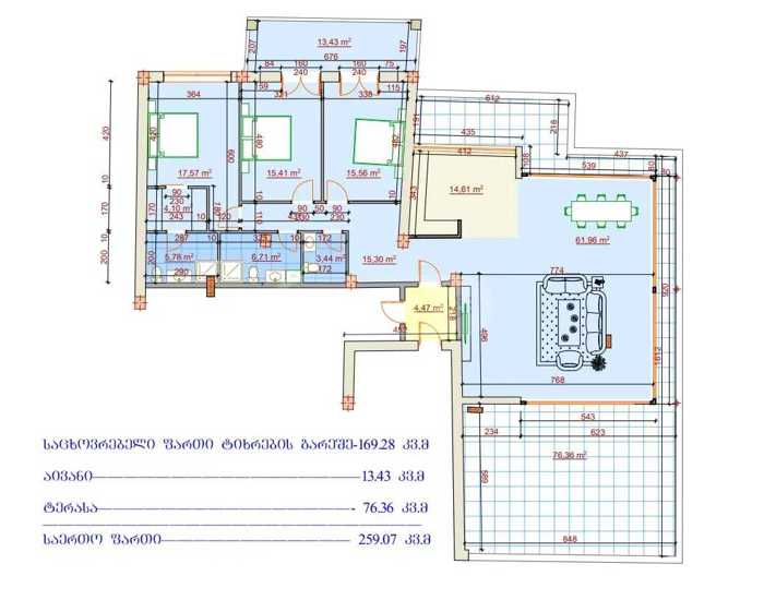 4-комнатный пентхаус площадью 259 кв.м в Ваке, Рамишвили 33, 11 этаж (зеленый каркас) с тремя спальнями (в одной спальне есть собственный санузел и гардеробная). Гостиная, три санузла, кухня, терраса. Хорошо обустроенный подъезд и двор. В цену включен 1 гараж для автомобиля, также есть возможность парковки во дворе спереди и сзади. Во дворе есть красивый сад. В здании охрана 24/7 и видеонаблюдение.