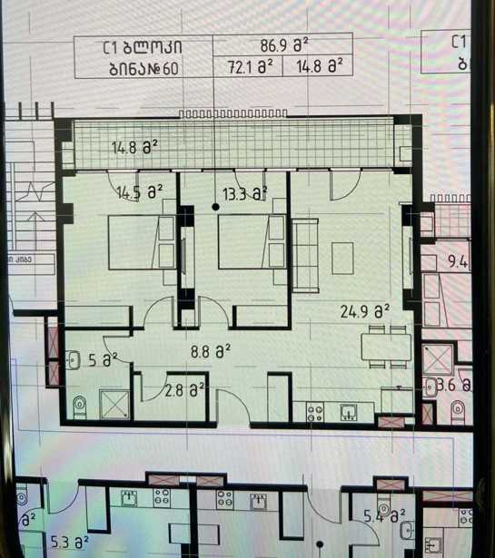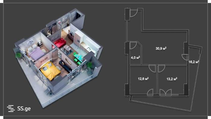 Продается квартира в новом доме, нестандартная 3-комнатная новая отремонтированная квартира. Студийный тип, 2 спальни, 2 балкона. На балконе железные шкафы, 1 с/у. В 'большом дворе' - (3345 кв.м. приватизированном сообществом), с местом для парковки. 200 м от станции метро Церетели, у перекрестка улицы Багратёни и Тевдоре Мгврдзелис.