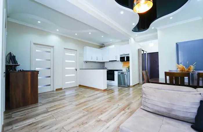 Продается на улице Любляна, в новом здании рядом с Карапс Медлайн, новая отремонтированная квартира на 1-м этаже (всего 7 этажей), общая площадь 90 м2. 2 спальни (одна с гардеробной), 2 ванных комнаты, гостиная-студия, центральное отопление, кондиционер, 1 балкон. Квартира продается с частичной мебелью. Цена 115.000$ эквивалент в местной валюте.
