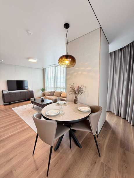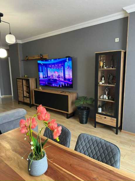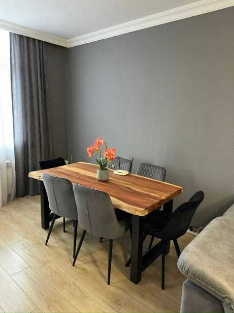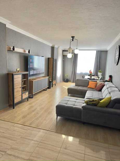Продается необжитая новая квартира с центральным отоплением, меблированная техникой. У нее 3 балкона; каждая из 3 комнат имеет свой балкон, с отдельной отведенной кухней. Ремонт выполнен из материалов высшего качества.