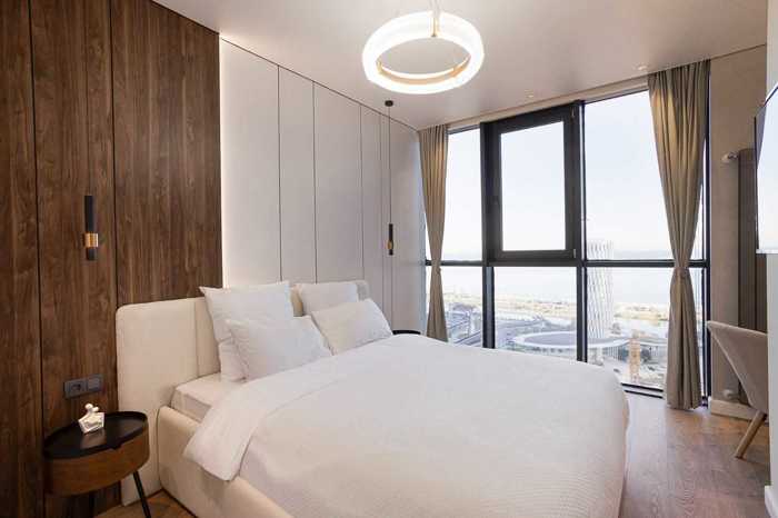 Продажа Квартира 2+1 Адрес и локация: ЖК Интурист Резидент (Улица Пиросмани, 17) Характеристики: Площадь — 77 м²; Этаж — 19+; Планировка — 2 светлые спальни, гардеробная, два рабочих места; Отопление — Водяной теплый пол (газ) + батареи Описание: Стильная квартира с премиальным ремонтом: мраморные подоконники, кварцевые столешницы, испанский керамогранит. Полная комплектация техникой SAMSUNG, включая стиральную машину с сушкой и 2 Smart TV. Продуманная планировка с большим количеством мест для хранения и встроенным скрытым сейфом. Уникальный прямой вид на море из ВСЕХ окон, а также вид на аллею Шартава. Расположение в престижном районе в центре города. Цена: 200 000 $ ID: OK105