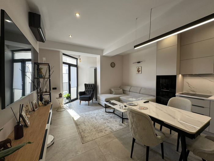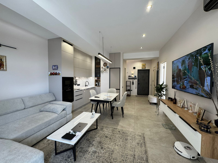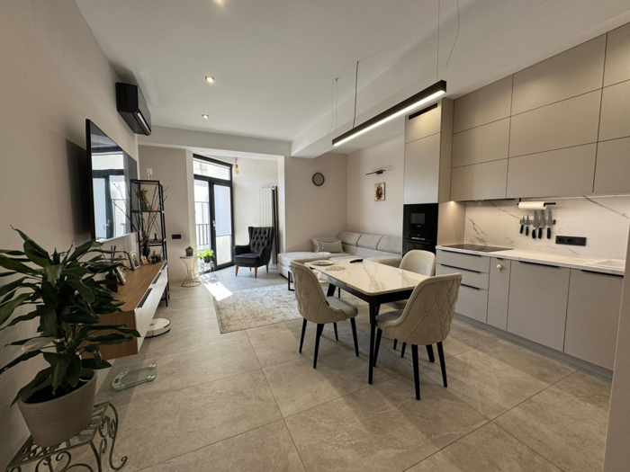 В новом здании в Атени сдается двухкомнатная квартира, отремонтированная с использованием высококачественных материалов, есть гардеробная комната.