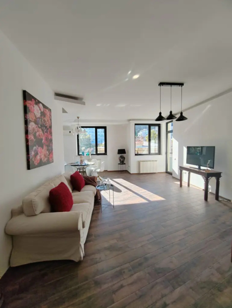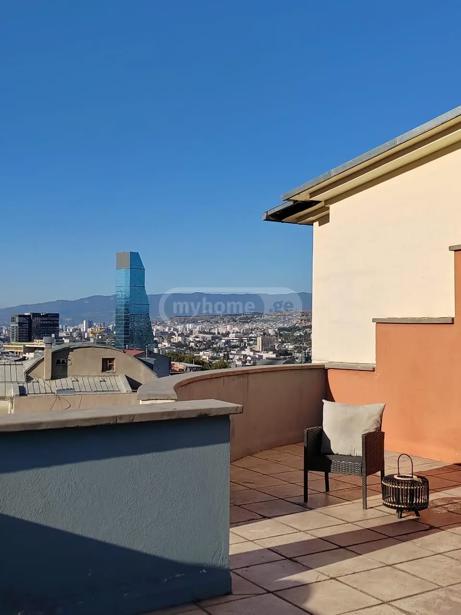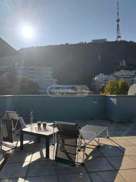 Сдается в аренду двухуровневая, угловая, светлая 3-комнатная квартира с собственной парковкой и верандой площадью 130 кв. м, с которой открывается прекрасный вид на Старый Тбилиси.