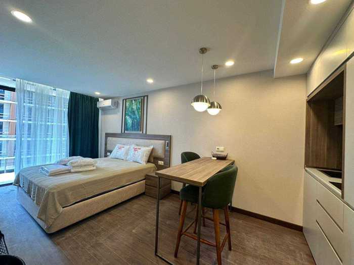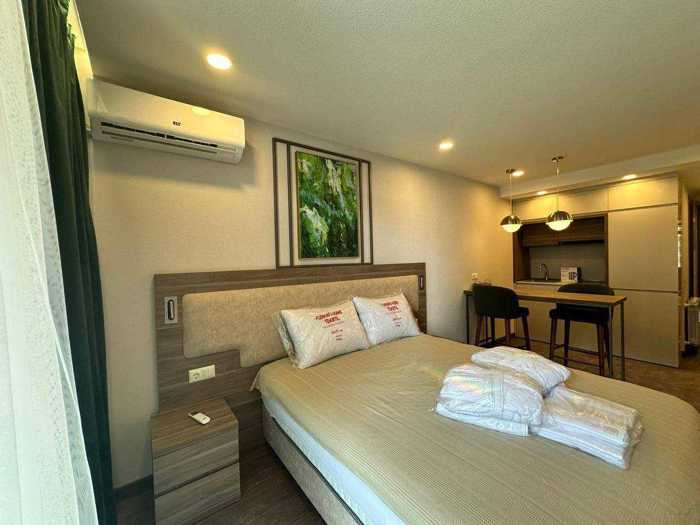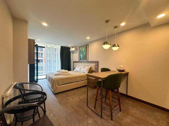 Продается квартира-студия с новым ремонтом на Новом Бульваре в комплексе премиум-класса - Rainbow, квартира оборудована всем необходимым для комфортной жизни, идеальна как для проживания, так и для сдачи в аренду, уютная и светлая комната, качественный ремонт и мебель, В комплексе есть тренажерный зал, бассейн, бар и ресторан, Круглосуточная охрана, видеокамеры, сервисное обслуживание,2 грузовых и 3 пассажирских лифта, подземный и надземный паркинг. 100 метров от моря. Адрес: улица Адлиа N2.
