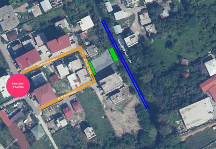 В продаже участок, в черте города. Статус: не сельхоз (можно владеть иностранцам). С участком идет утвержденный, проработанный проект 2 этажного дома с высоким первым этажом, где можно разместить 2 подъемника или сделать еще один этаж. Помимо проекта, есть уже готовое разрешение на строительство. С передней части участка - дорога с заездом с двух сторон, т.е. фактически на участок можно заехать по 2 дорогам, с одной стороны жилой дом, с другой - коммерческие помещения. На тыльной стороне - около 3-4м не учтенной земли и река Меджинискали. На рисунке отображено зеленым - не учтенная земля, т.к. сам участок по документам 360м2, по факту почти 500. В пешей доступности продуктовый магазин, в этом районе участки идут уже по 200$ за м2, мы продаем за 160$. Так же на участок уже подведено электричество и вода. Можно подключить газ, но уже когда будет к чему подключать. Ближайший счетчик газовый - от соседнего здания прямо на границе участка, т.е. ближе уже некуда, подключить газ будет максимально просто тоже. Идеально подойдет под мастерские с офисом (изначально под это и планировался, пока не усложнилась перевозка авто). Небольшие производства и т.п. вокруг много жилых домов, но есть и парочка СТО и мебельных цехов. Цена без торга, вложено много времени, и кто занимается землей, знает, что сейчас небольшой участок в городе еще и переведенный, будет стоить в разы дороже, на сегодня стоимость перевода такого участка в несельхоз стоит как треть цены на этот готовый объект. Не говоря уже о времени и т.п. Предложение реальное и выгодное. Лучше не звонить, а писать в Whatsapp. Телефон беру только вечером.