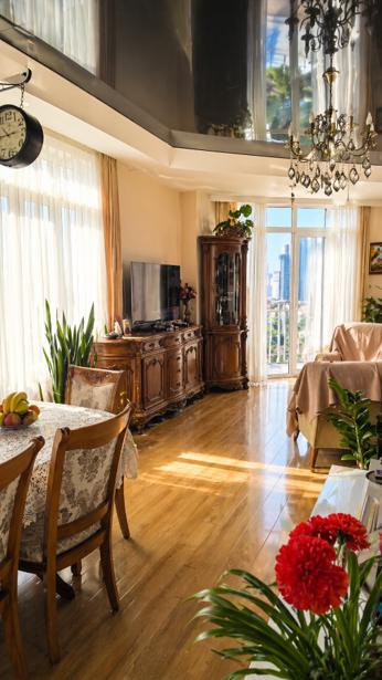 Продается просторная угловая квартира 99 м2 2+1 ул. Селима Химшиашвили, 20 Высокий этаж Панорамный вид Балкон на всю квартиру 2 светлые спальни Гардеробная, можно сделать кабинет или дополнительную темную спальню 2 санузла Газ Центральное отопление Обновленный ремонт в спальнях Частично с мебелью